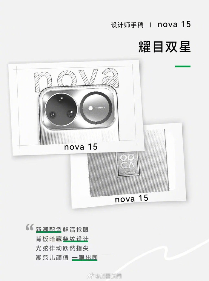 #华为nova15外不雅曝光#华为结尾官方发布nova15系列预订海报,公布全系将于12月15日12:08认真开启预订。新品主打色为高填塞度绿色,同期镜头模组缱绻也松懈了行业通例:独有的横向立体双圆造型,与主流缱绻决议酿成领悟对比,成为该机型最隆起的外不雅标志。集合前代家具特质,商场预计新机可能会进一步优化机身厚度,带来更微弱的持持手感,后续可通过发布会了解更多家具细节。#华为nova15全系开启预订#
